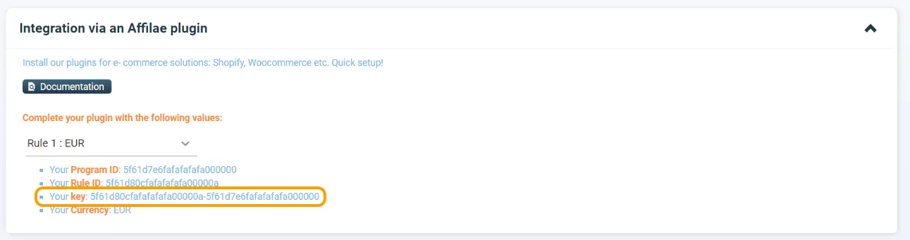➜ You’ll find the KEY in the Configuration menu, then Tracking tab and Integration via an Affilae plugin part.