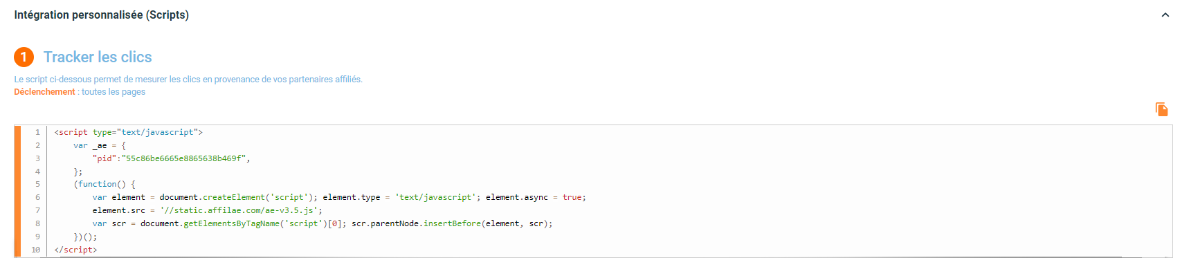 Copier – coller le script de sécurité, présent dans la partie « tracking » de la page « Configuration » de votre compte Affilae. Vous trouverez ce script dans la partie « intégration personnalisée », « tracker les clics ».